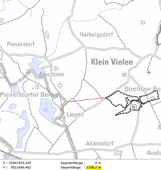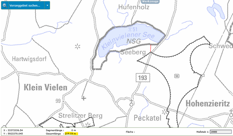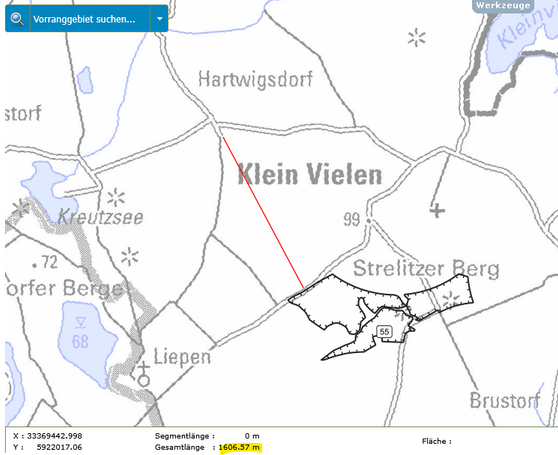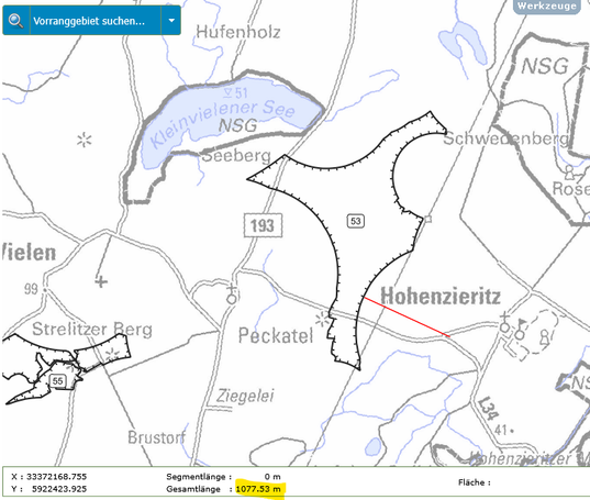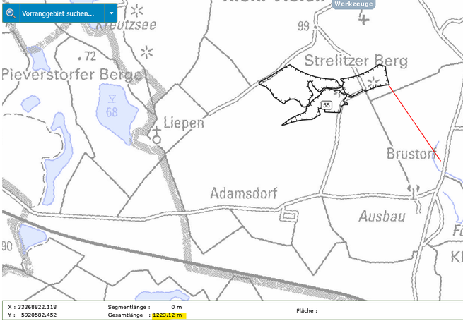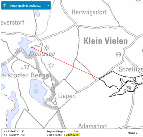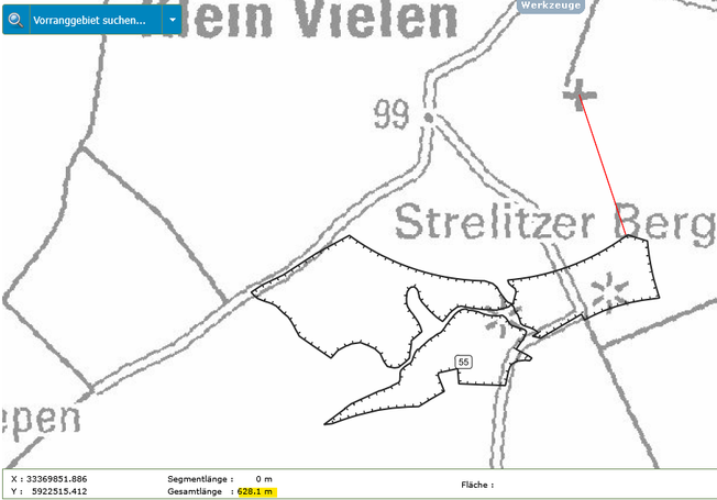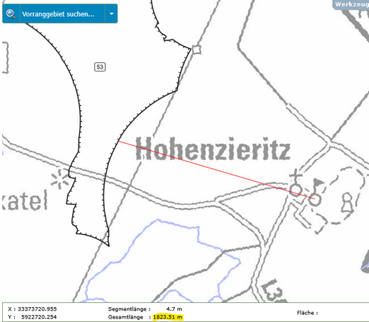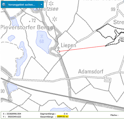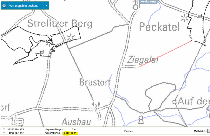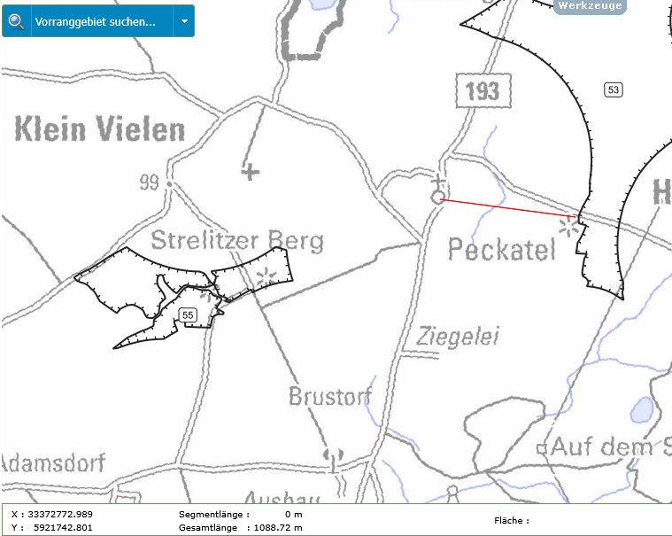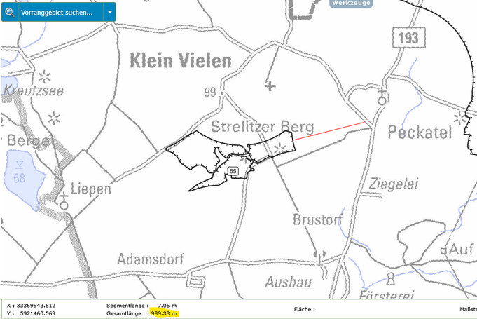 In der folgenden Bildergalerie seht Ihr Abstandsmessungen der beiden Gebiete zu den Orten, Naturschutzgebieten und Einzelgehöften. Die Messungen wurden mit der interaktiven Karte des Planungsverbandes erstellt. Dies kann jeder selbst nachvollziehen. Einfach auf den Button unter dem Text klicken.