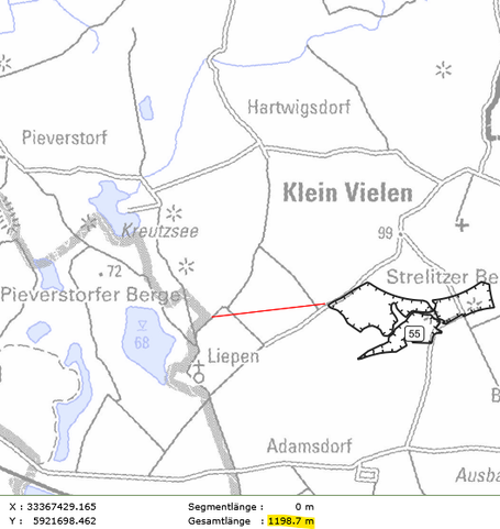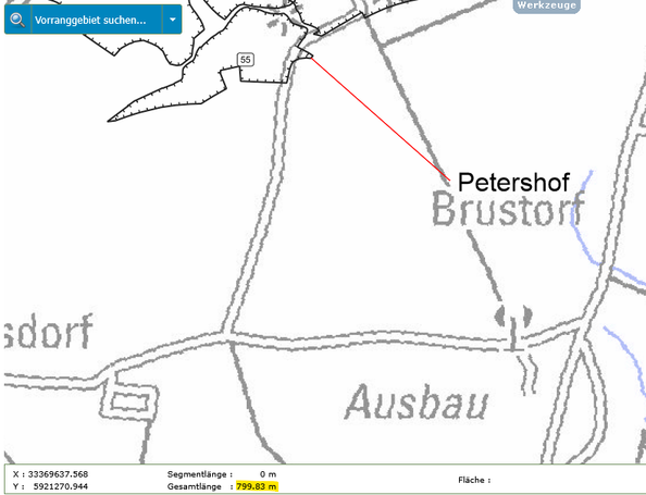 Die Messung ist durch eine rote Line in der Karte eingetragen. Der Messwert ist unten im Bild gelb markiert.